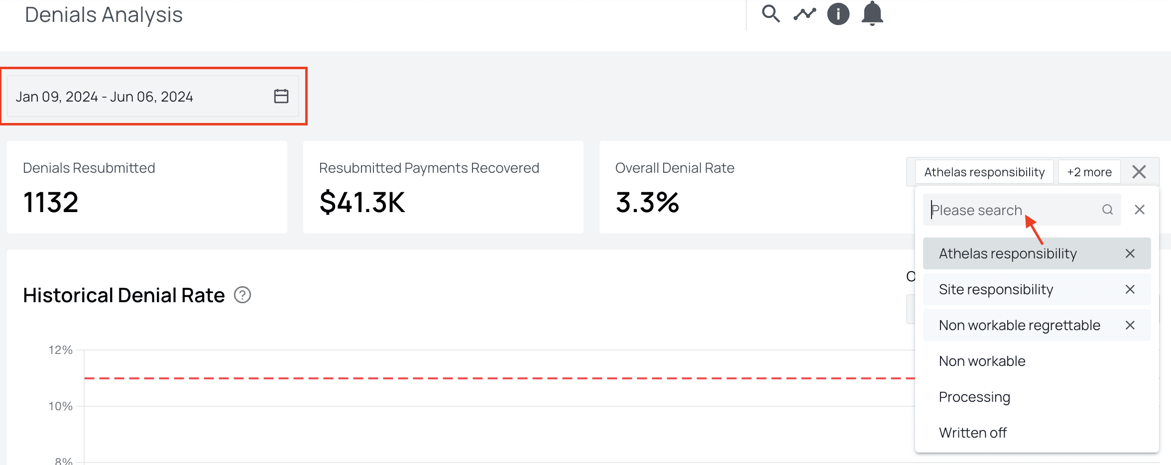The goal of the Denials Analysis page is to give your practice clear, accurate, and prompt visibility into denials metrics. With this information, you can track how your practice and Athelas are working together to minimize denials over time, as well as the amount of revenue recovered through successful claim resubmission.Information Available in Denials Analysis