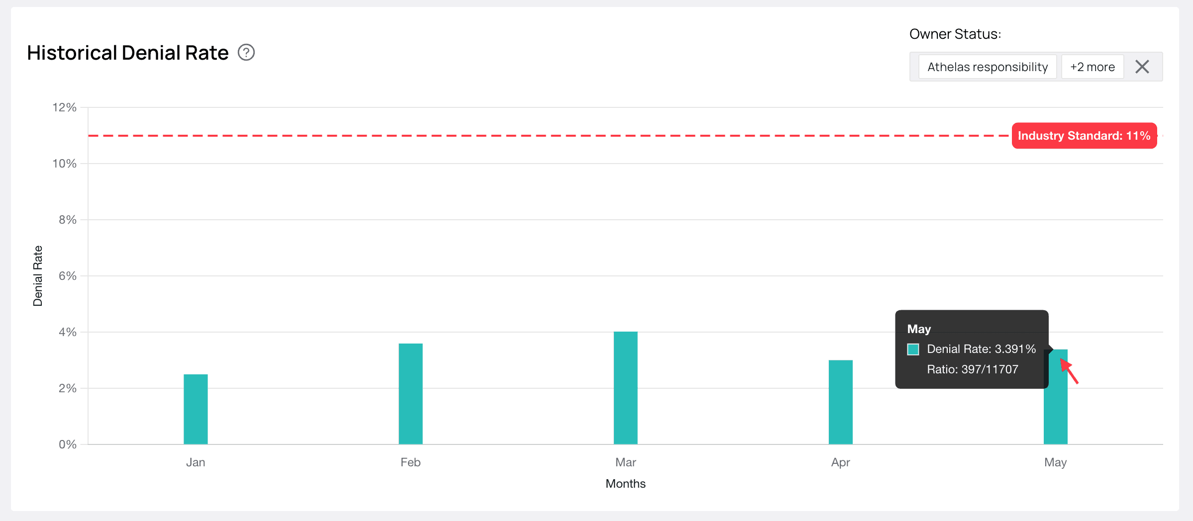 On this bar graph, you can see your practice’s monthly denial rate. Hover your cursor over one of the bars to see the exact ratio of denials against other claim outcomes. The dotted red line marks the aforementioned 11% industry standard denial rate.