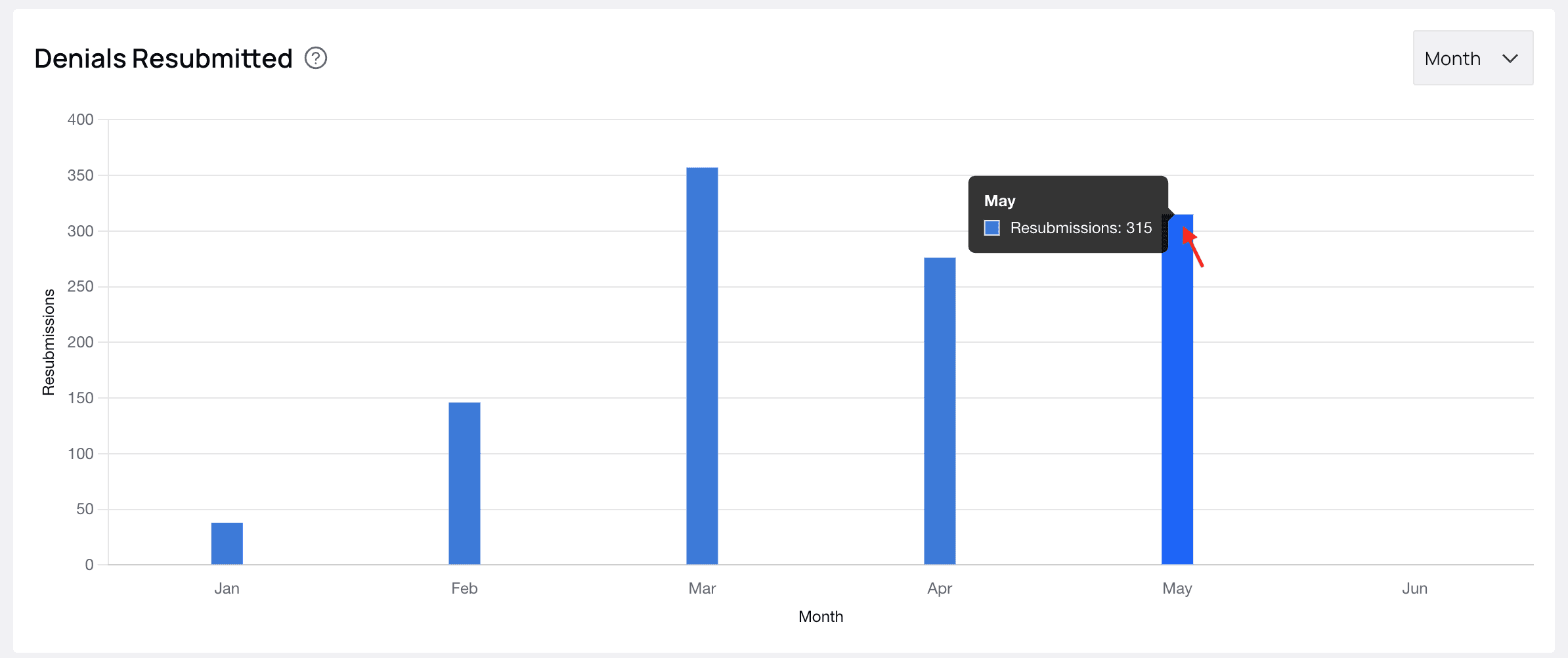 This graph shows how many denials have been edited and resubmitted. This will give your practice a better picture of the work Athelas is doing behind the scenes that may not otherwise be apparent. You can filter this information in the top right corner to show monthly or weekly results.