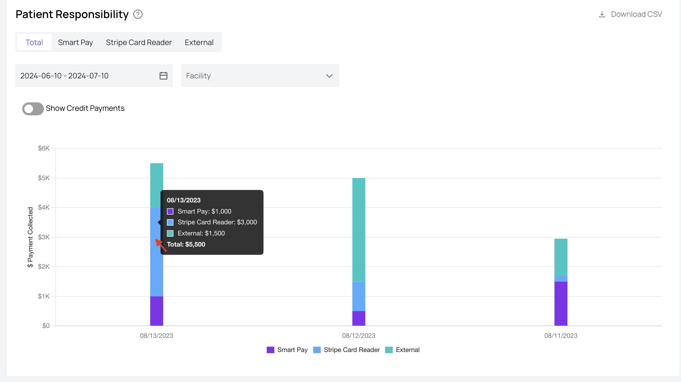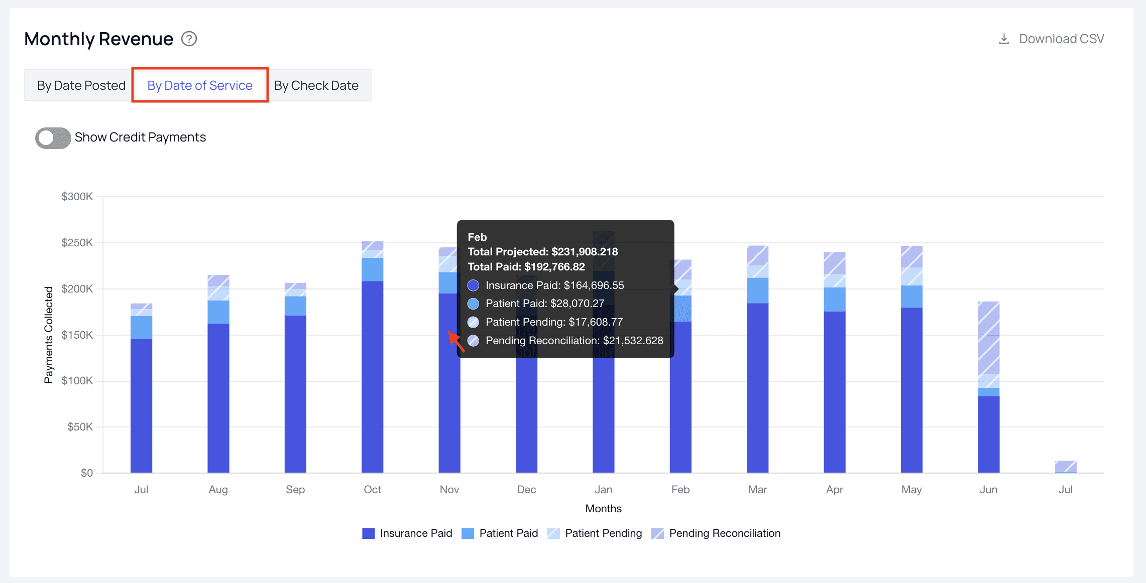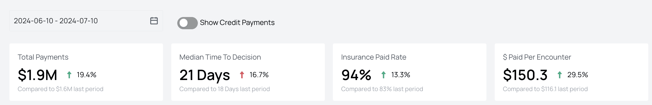 - Total PaymentsThis number shows the sum of all payments from payers and patients for the given date range. You can see how it compares both in percentage and real dollars to the previous period.