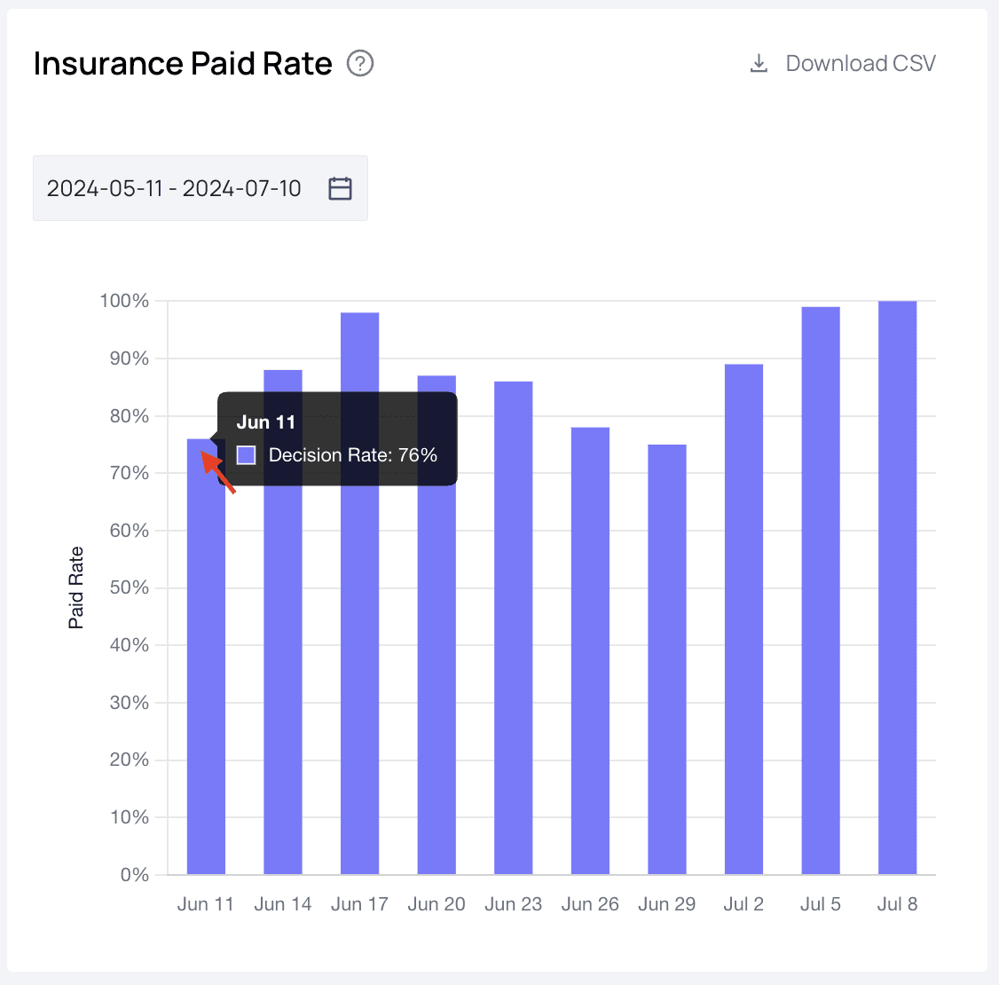 - Insurance Paid RateThe higher the better. This number shows the percentage of claims successfully paid, as well as how that number compares with the previous period.