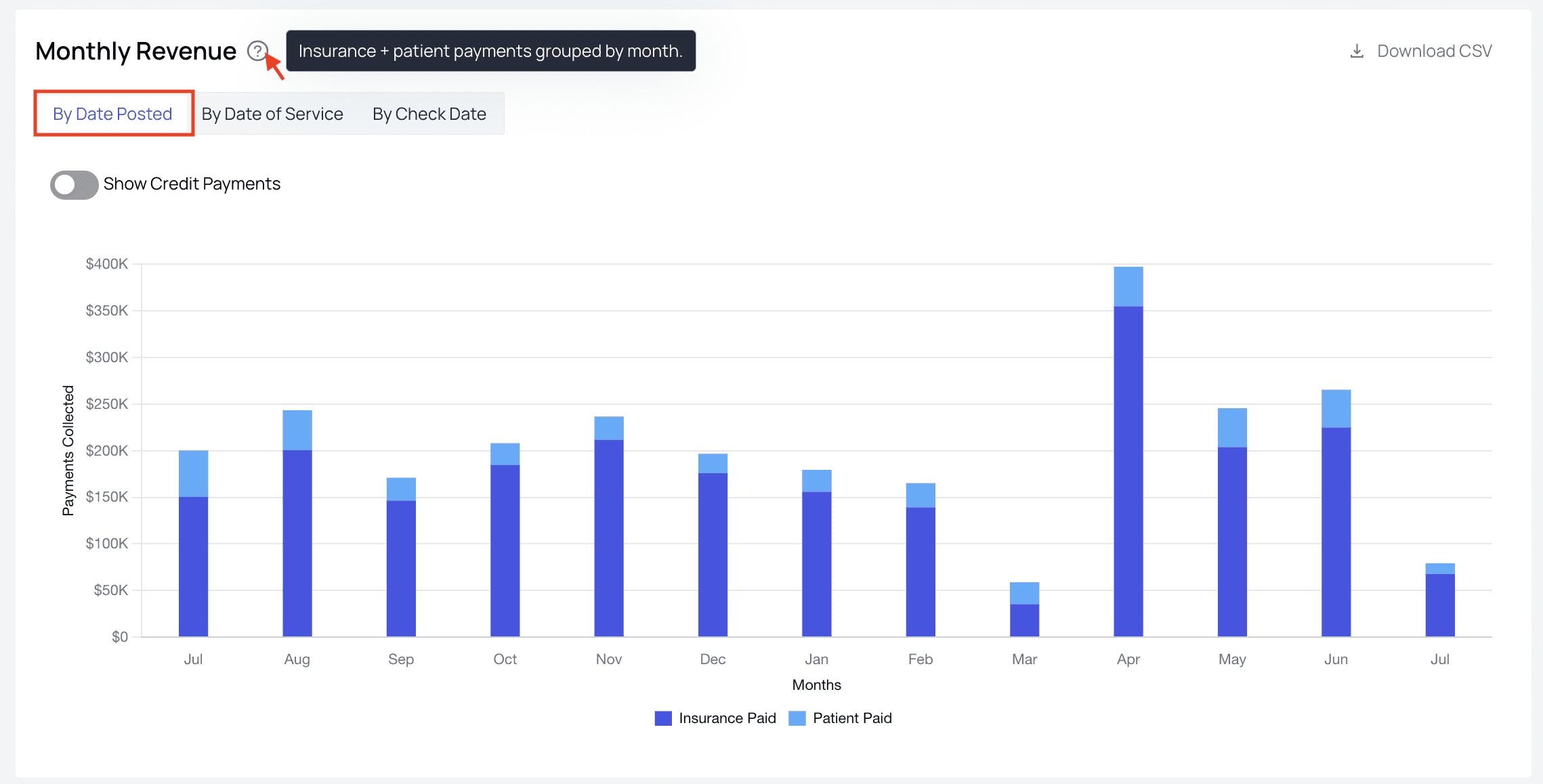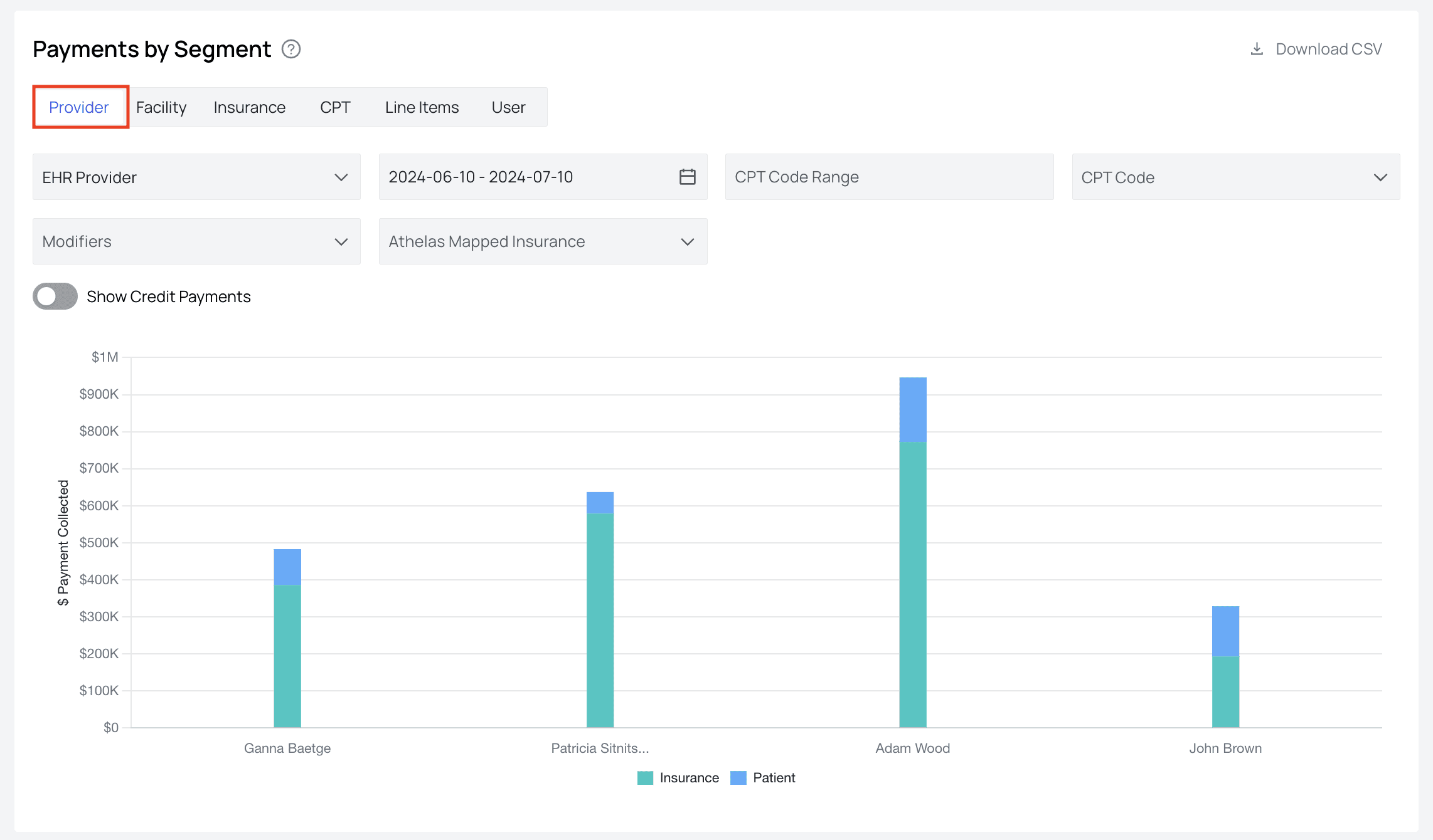 - $ Paid Per EncounterThe average dollar amount paid to your practice per patient encounter. Each section that follows has a ‘Download CSV’ button in the top right corner. Use this if you would like to analyze the raw data in Excel, Google Sheets, or some similar spreadsheet.