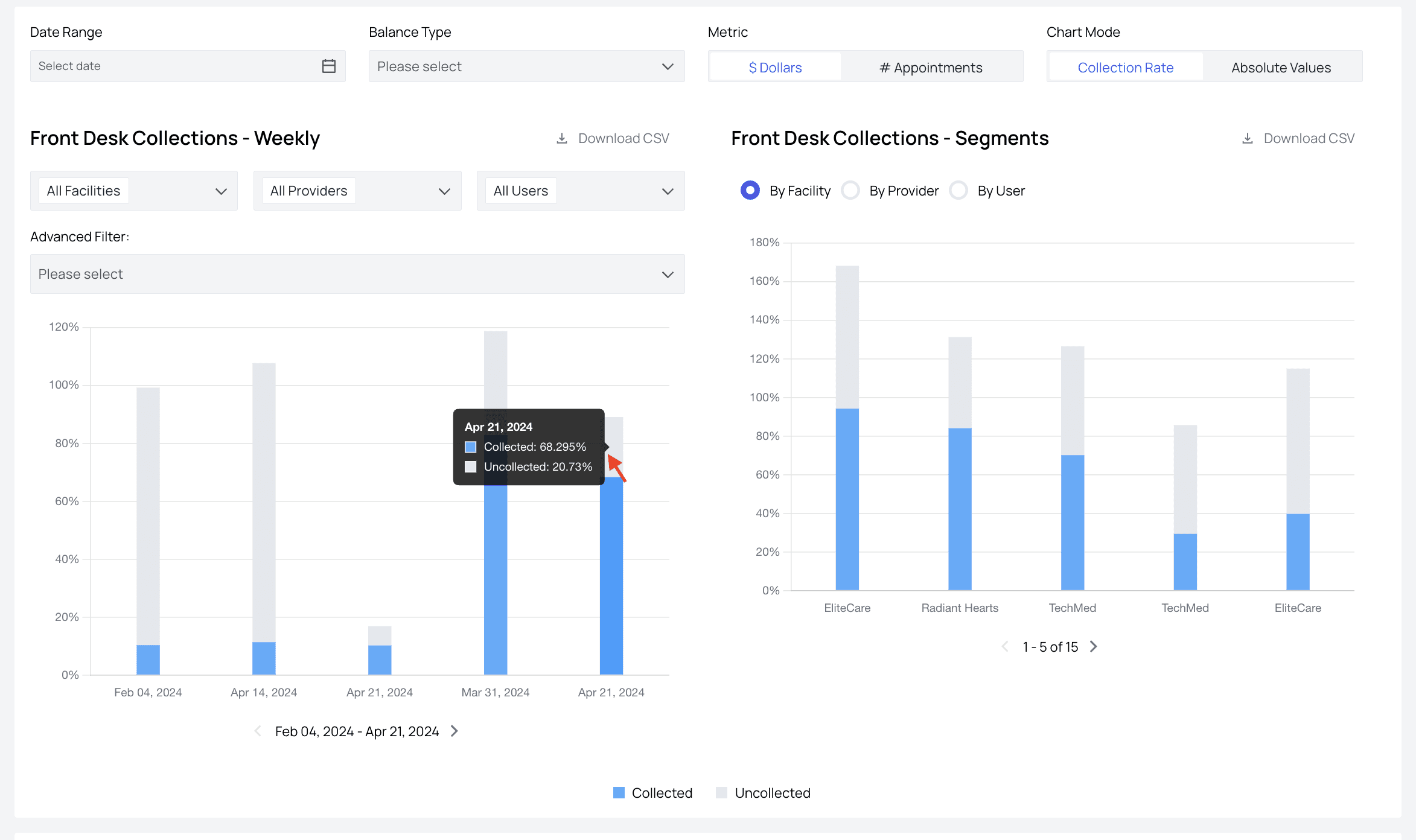 The Revenue Analysis page in Insights allows you to view overall figures and trends in your practice’s collections, as well as the ability to filter results down to individual dates, payers, facilities, or providers. When you know exactly how much revenue is generated over specific time periods from either aggregate or individual providers, payers, and even CPT codes, you can optimize your practice’s resources, spot red flags more quickly, and improve the overall financial health of your organization.Features of the Page