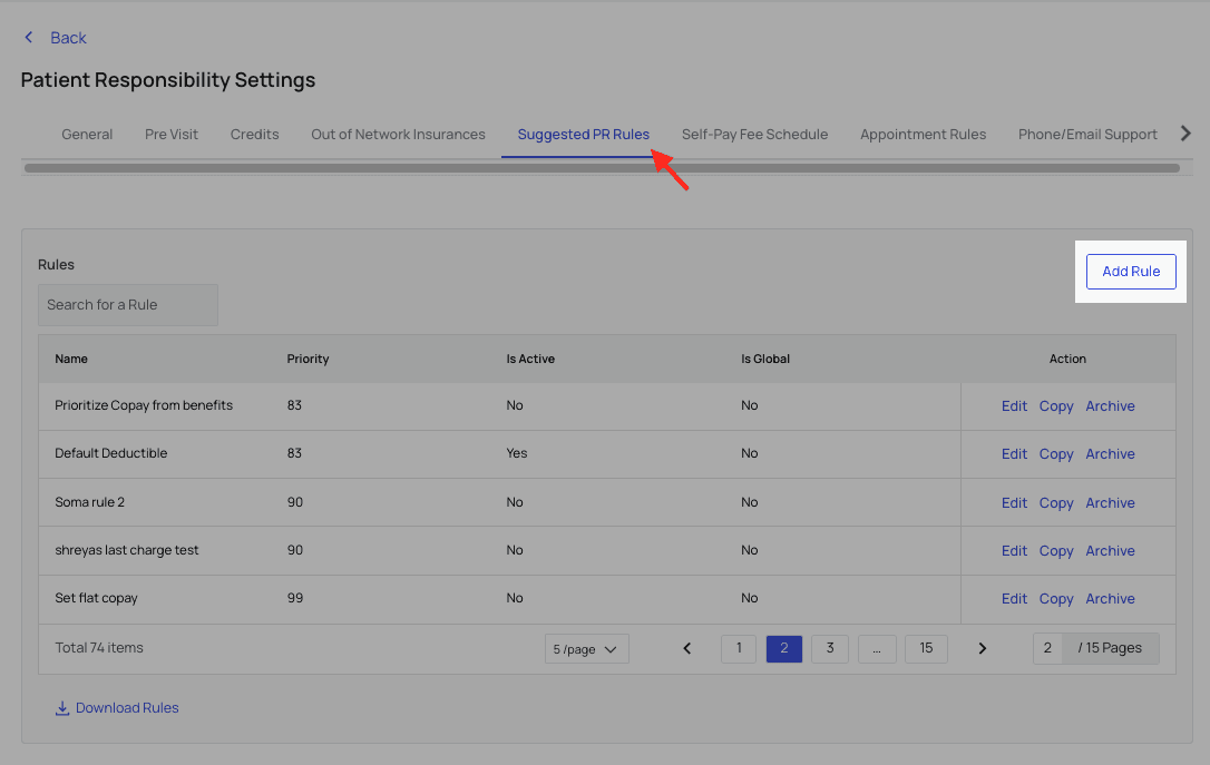 Currently, you can set Suggested Charge Rules via the Suggested PR Rules tab in Patient Responsibility Settings. ClickAdd Rule.