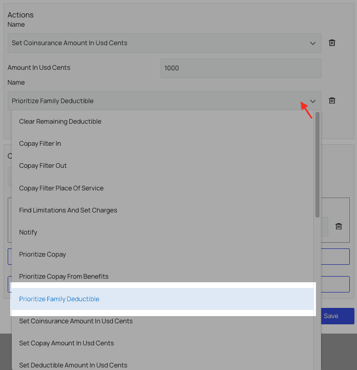 Add Action and select ‘Prioritize Family Deductible’ from the new dropdown menu.