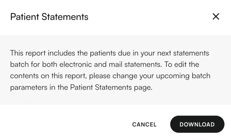 - This report does not use any filters. If you would like to edit the contents on this report, please change your upcoming batch parameters in the Patient Statements page in Insights.