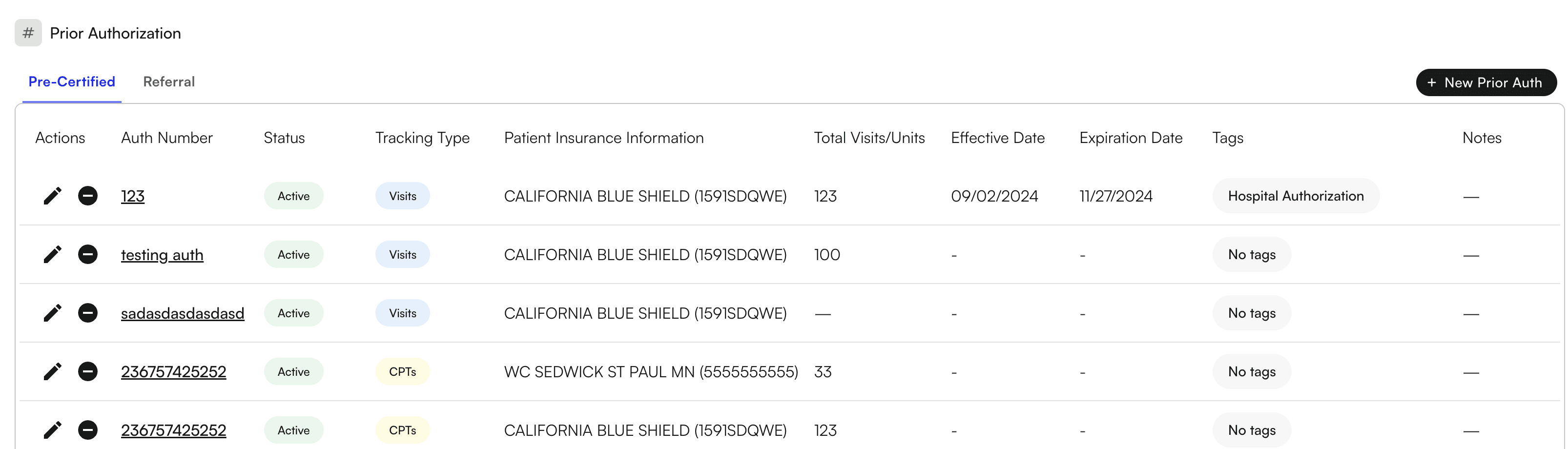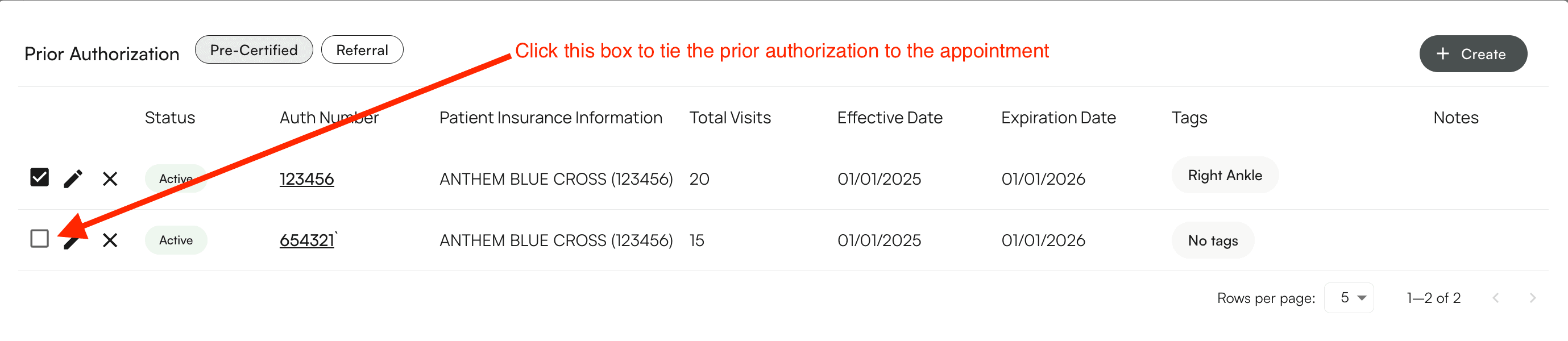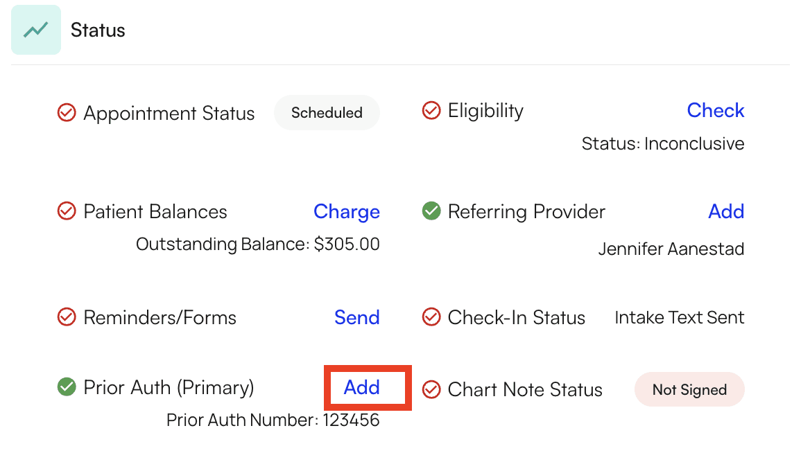 If a patient enters the clinic with a new prior authorization, you can easily add that information on their appointment details. Click on Add next to Prior Auth (Primary). A new window will appear showing all of the patient’s prior authorization numbers.