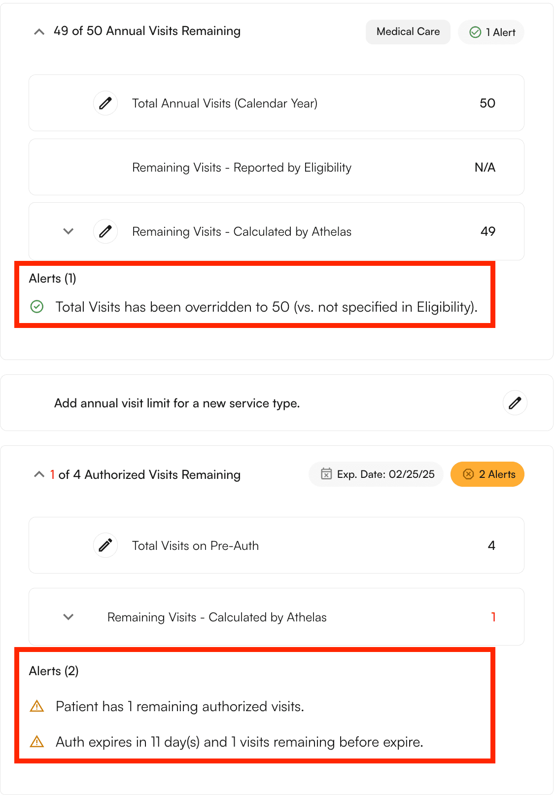Air has built in alerting surrounding prior auths, annual visits and Medicare threshold limits. When effective dates near their expiration date, or visits are running low- you will receive an orange alert. If the appointment is past the effective date, or no longer has any visits remaining you will receive a red alert. Annual visits, along with prior authorization effective dates and visits can also be edited within this section directly. When each section is expanded, detailed explanations of the alerts will appear for more context. The pencil icons will allow you to edit or update any of the information directly in this section.