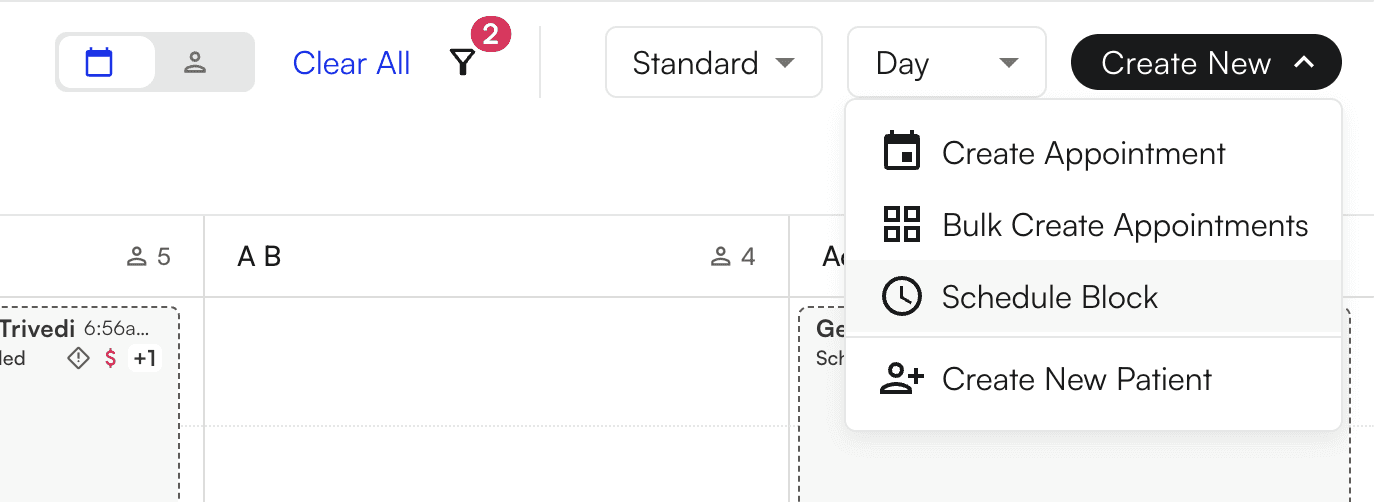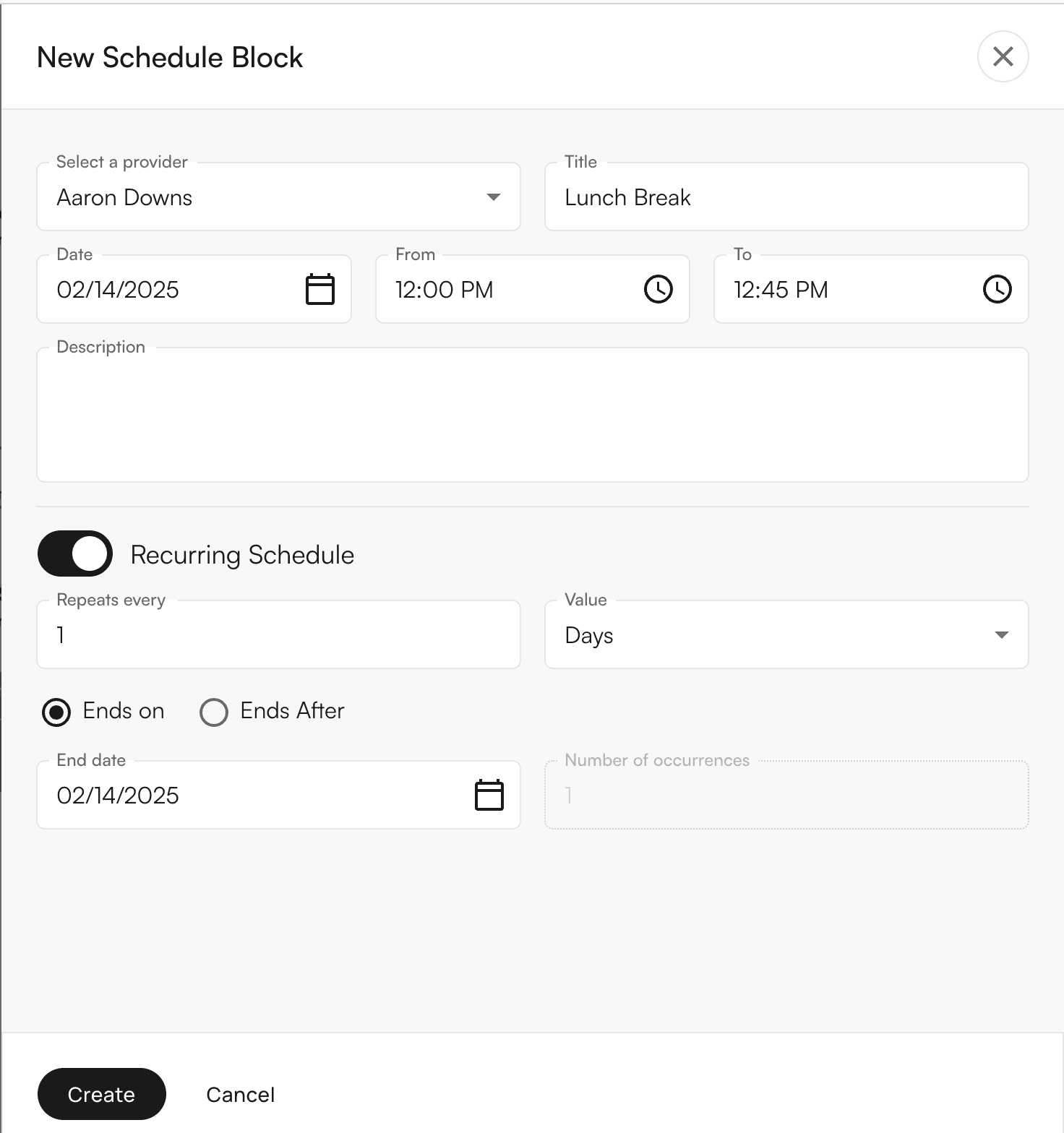 Schedule blocks are ways your practice can block out time for meetings, admin days, vacations, or anything else. Similarly to scheduling an appointment, you can create a time block directly on the calendar itself or on the top right corner under *Create New *and selecting Schedule Block. A side panel will appear with the ability to select the provider, title and time/date the block occurs. This can also be set up to be a recurring block which can be configured for multiple day and occurrences as well as end on/after a specific date.