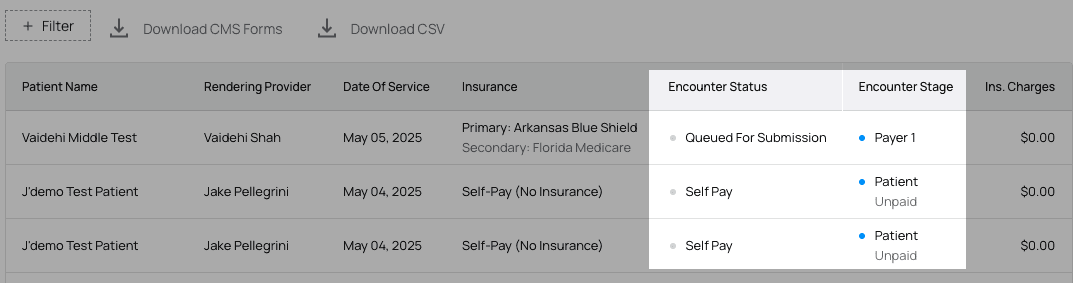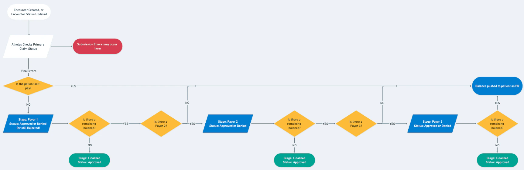 Encounters are created for each appointment. If the claim submission is successful, then primary insurance—or Payer 1—will either deny the claim or send a remittance and pay at least part of the claim. Once Payer 1 pays everything they’re going to pay, any remaining balance is pushed to the next payer. This process repeats either until the claim is balanced or there are no more payers and the balance is pushed to PR.Definitions of Stage and Status Terminology
