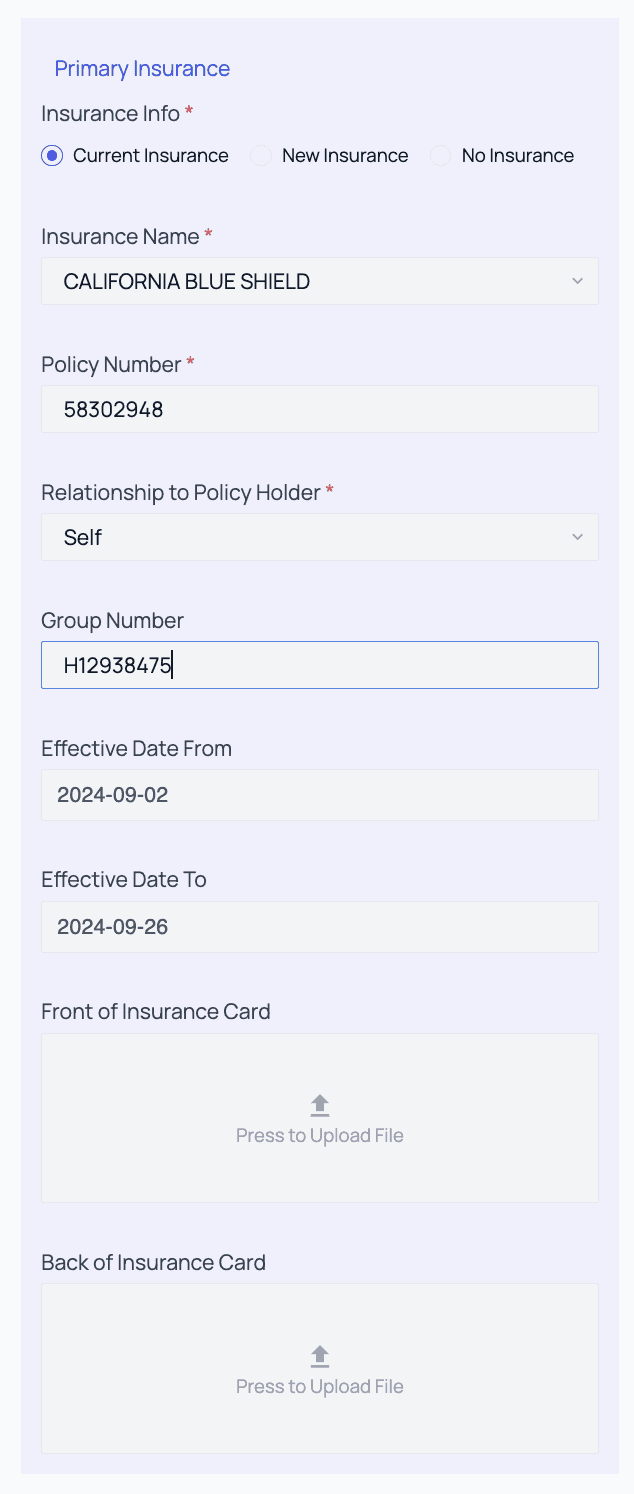 New Insurance: A blank form, patient adds new insurance information to be updated in the appointment
