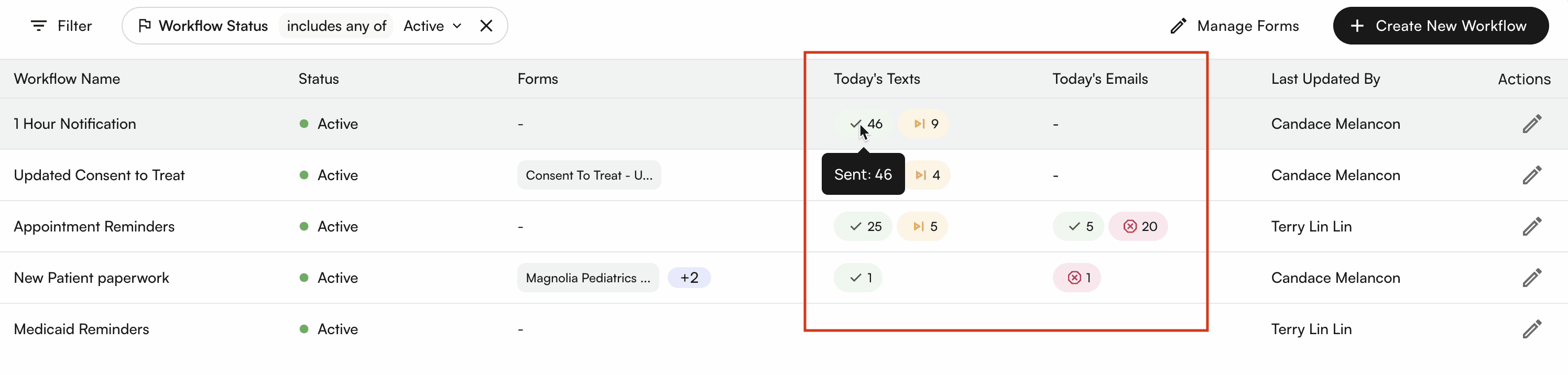 On the main table, users are able to see per workflow how many messages are going still going out in that day and how many were already sent. That allows them to check at a glance if something is wrong with their configs.