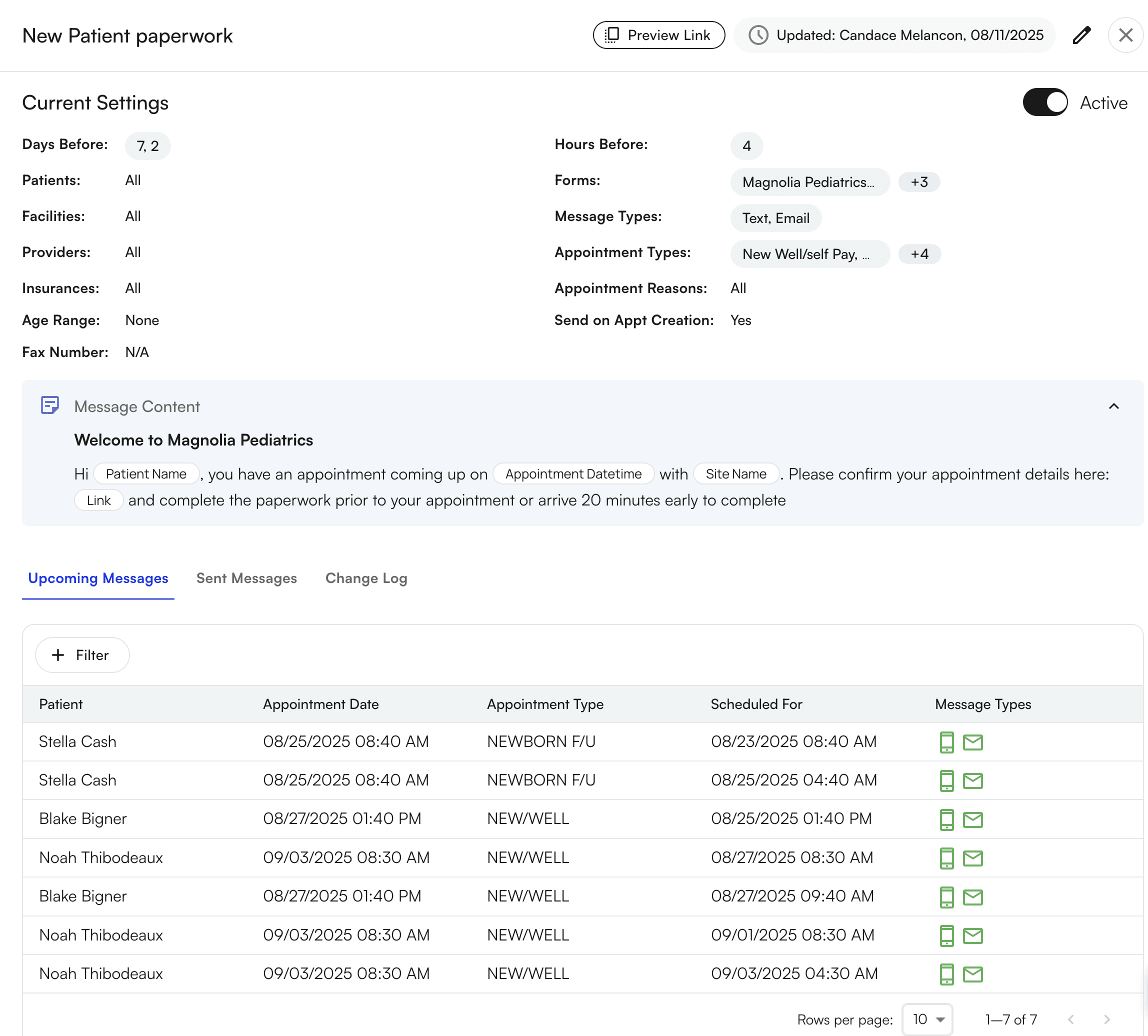 Using the workflows page, you are able to customize exactly which appointments get sent specific intake forms and even configure the message and time when they’re sent out. At the top of the page, you’re able to name your workflow and then configure the specifications which the intake forms and appointment reminders will be sent out.