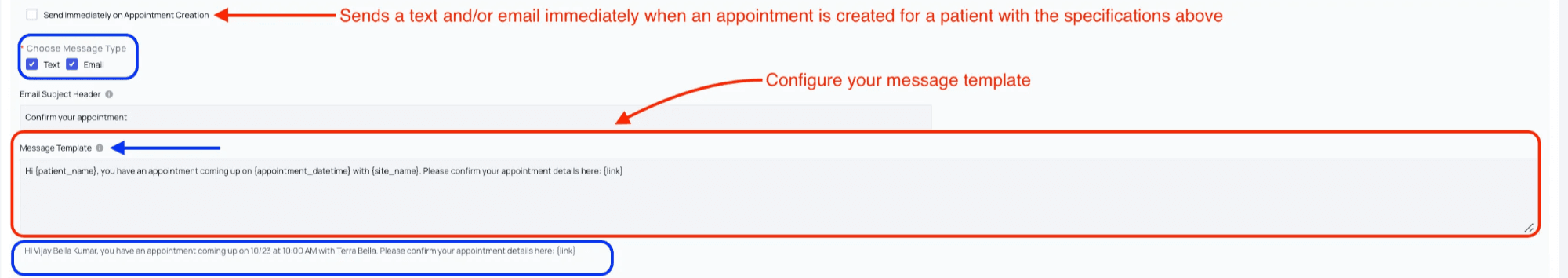 - Maximum Age: Specifies a maximum age a patient cannot surpass in order to receive this workflow The option to send out intake forms immediately upon the creation of an appointment matching the workflow’s specifications is also available. Simply check the box next to Send Immediately on Appointment Creation. Additionally, there are two methods that the workflow can be sent by: email and/or text.