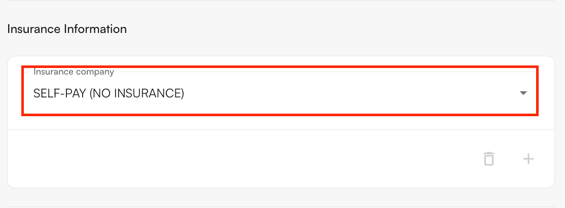To add Self-Pay as an insurance, type in “Self Pay” into the Insurance Company field. Upon selection, the insurance details will disappear and leave only “Self-Pay (No Insurance)”