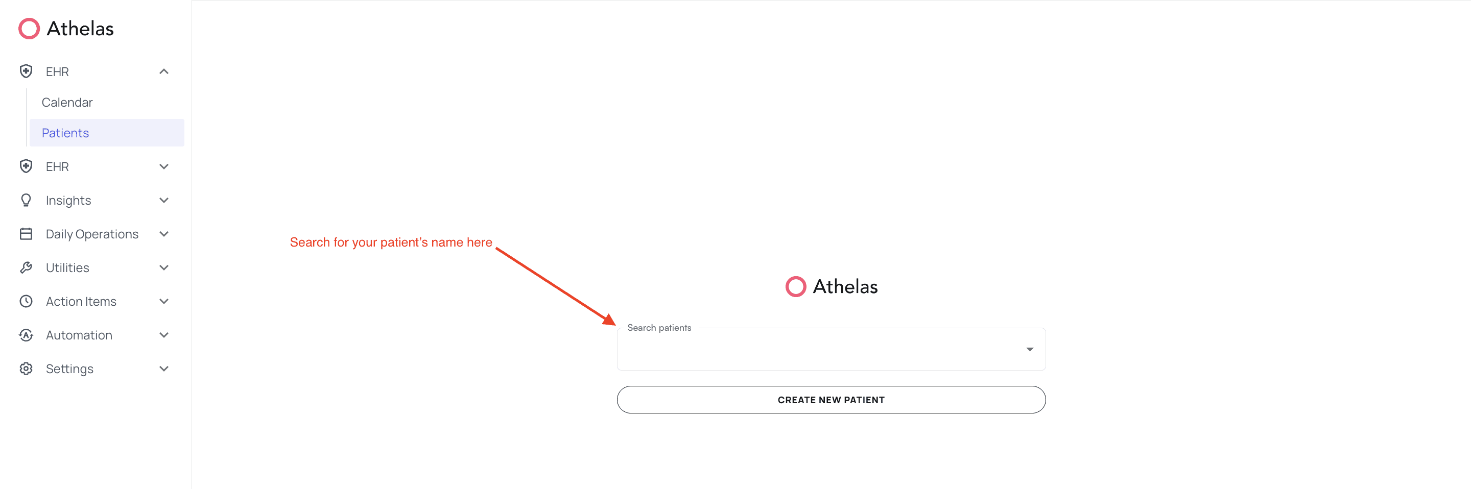 Navigate to Patients tab within the Navigation bar, and search for your patient’s name here