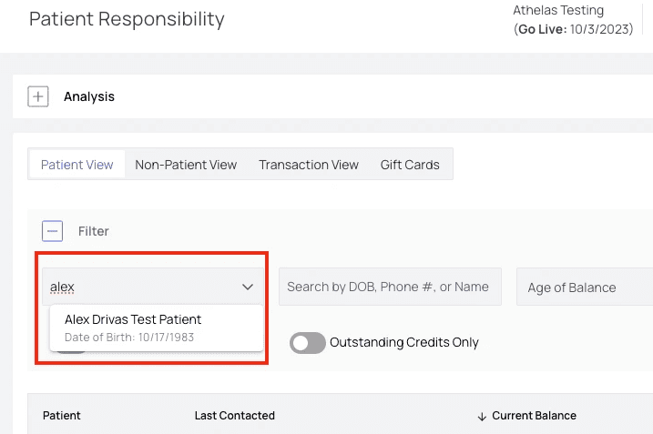 Navigate to the Patient Responsibility tab. Click into the ‘Patient’ search field and enter the name of the patient. Click the patient name where it appears in the list to enter the patient’s account.