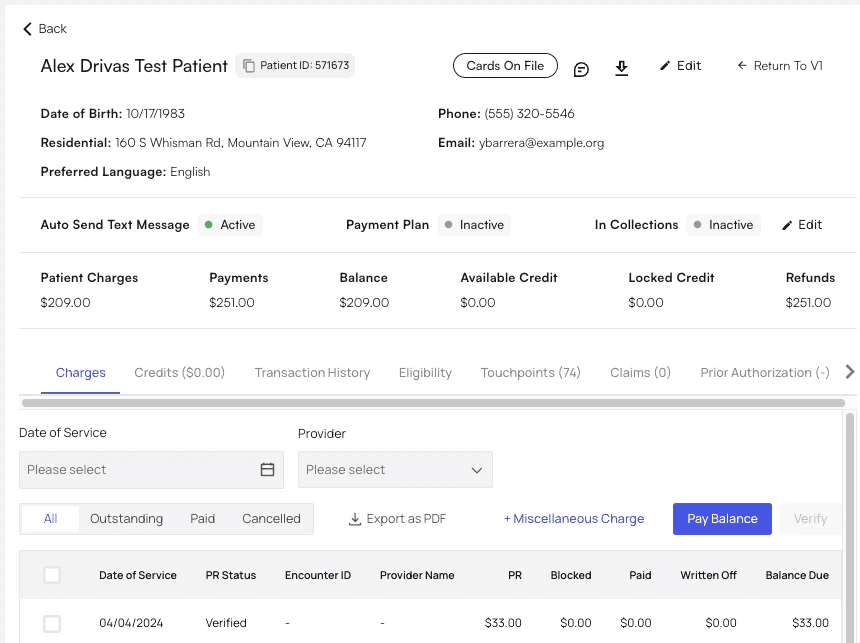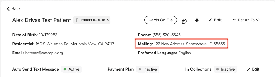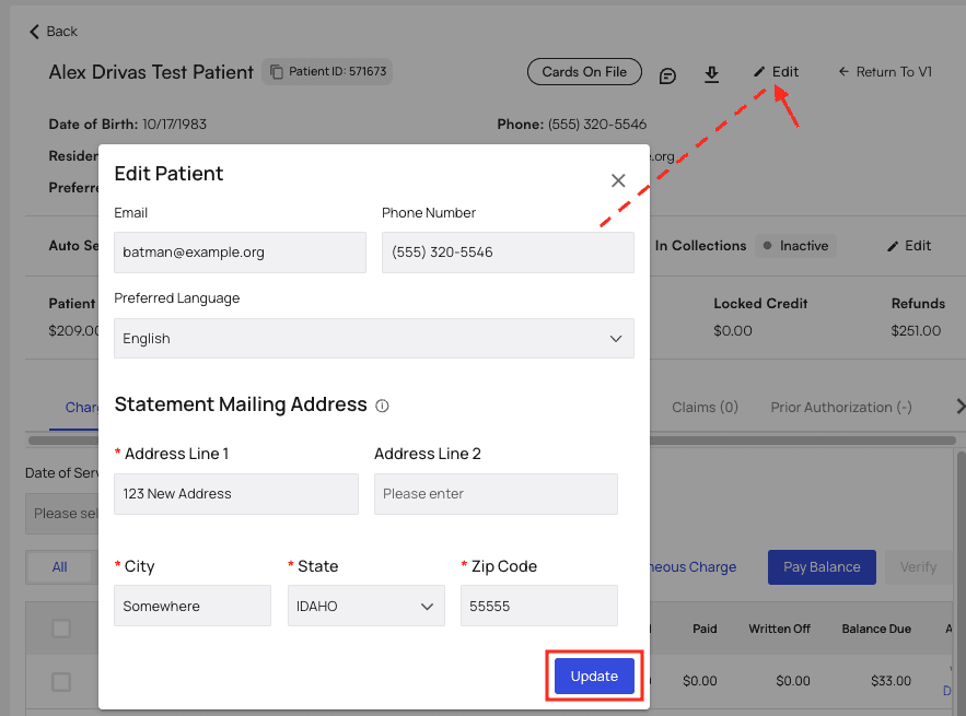 To change the patient’s email address, phone number, or statement mailing address, click the ‘Actions’ menu and choose ‘Edit.’ As previously mentioned, basic identifying information like patient name and home address cannot be edited here. Update that information in your EHR first and it will appear in Insights within 24 hours. A new window will appear. Update the fields you would like to change and then clickUpdate.