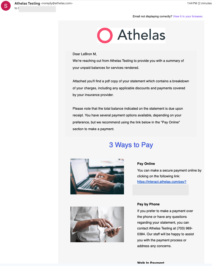 The email payment request offers three ways for the patient to pay: online, by phone, or in person. The online option includes a patient payment link.