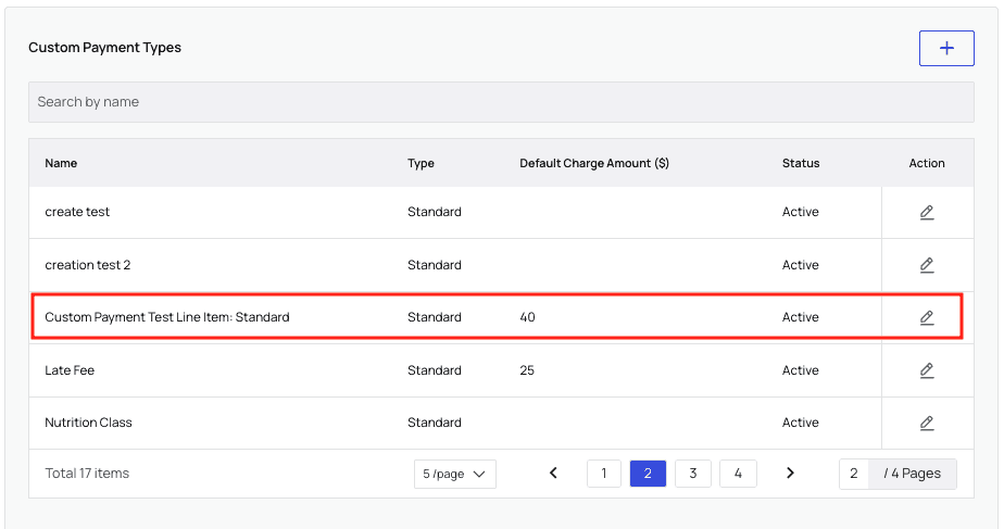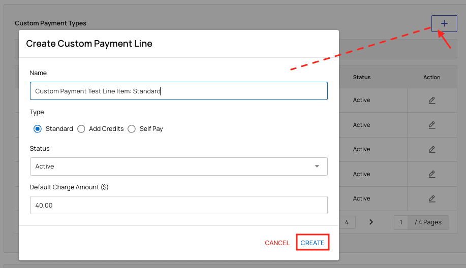 In the General tab of PR Settings, scroll down to the ‘Custom Payment Types’ section. You’ll see a list of all currently active and disabled line items. The ‘Active’ items populate the list of options you’ll see when charging patients later. To create a new line item, click the+ button. A window will pop up for you to edit.