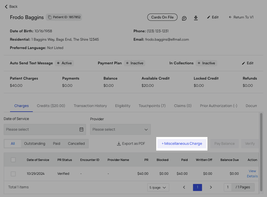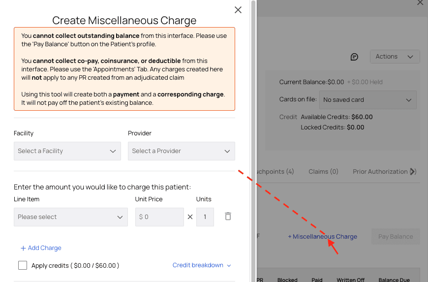 Navigate to the patient’s profile and, in the Charges tab, click+ Miscellaneous Charge.