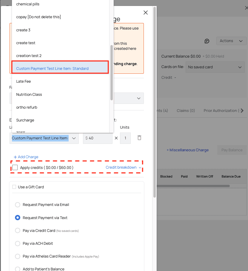 This guide covers line item charges that are separate from insurance payments. For example, if insurance will pay for an injection, but not the substance injected, you can charge the patient for the substance with a line item charge. Note: This feature may have access restricted to only Administrators and Billing Managers at your practice.Create a Line Item