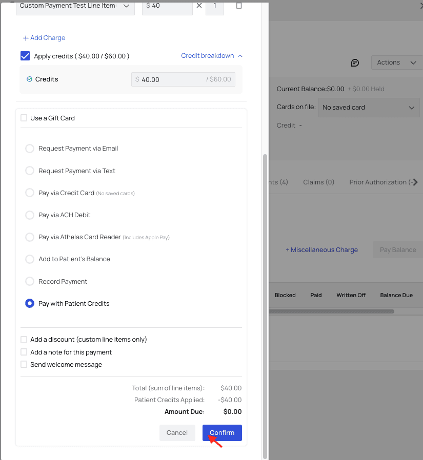 Then, choose how you would like to process or request payment. For this example, we’ll choose to ‘Pay with Patient Credits.’