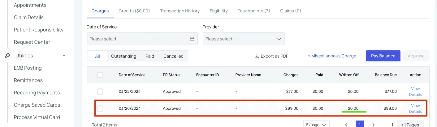 In the ‘Charges tab (or Transaction History tab), find the line with the written-off charges you want to reverse and click ‘View Details.’