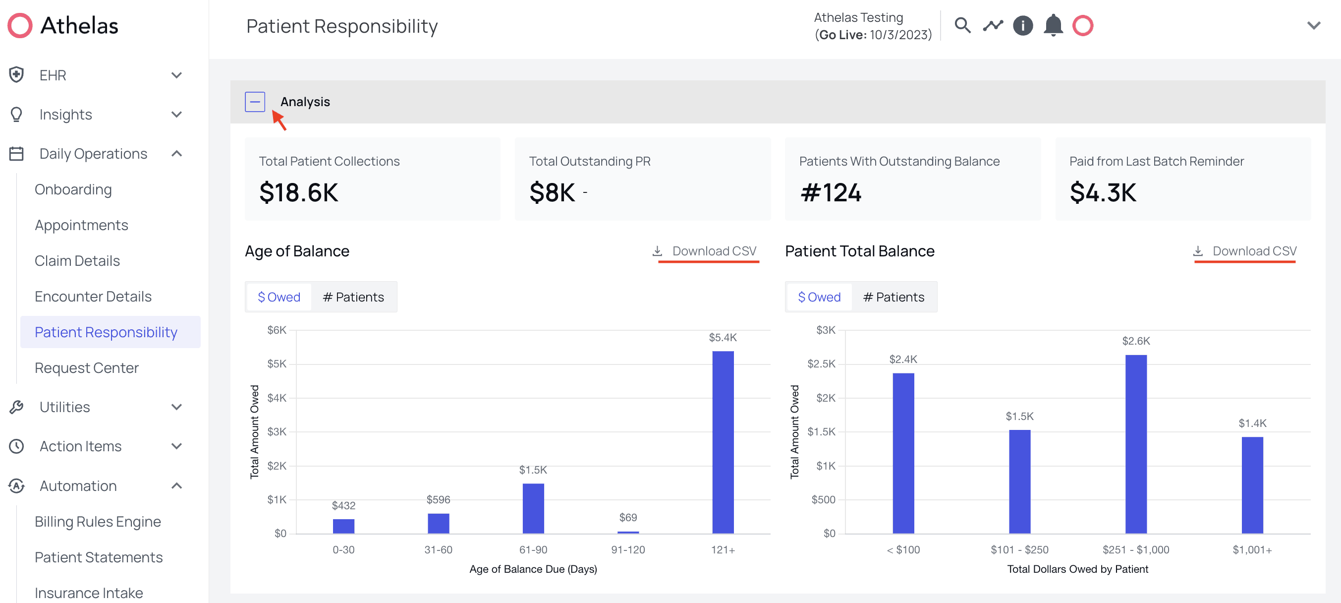 At the top of the Patient Responsibility page, you can click to expand or collapse the Analysis window.