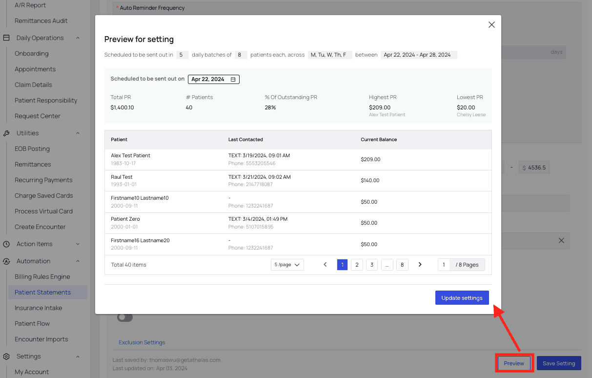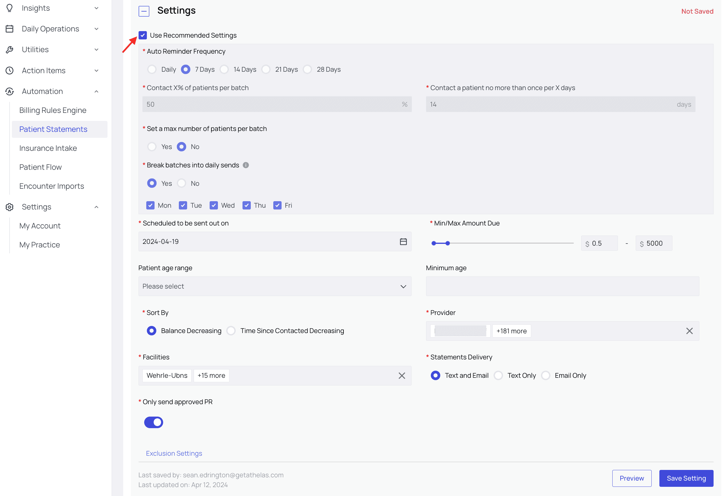 On the Patient Statements page, scroll down to Settings. Here, you’ll see a wide range of customization options — Auto Reminder Frequency, Contact X% of Patients per Batch, etc. There is also a checkbox you can click to Use Recommended Settings.