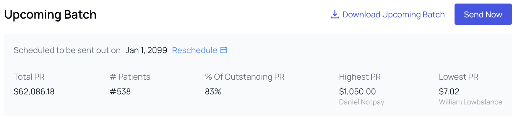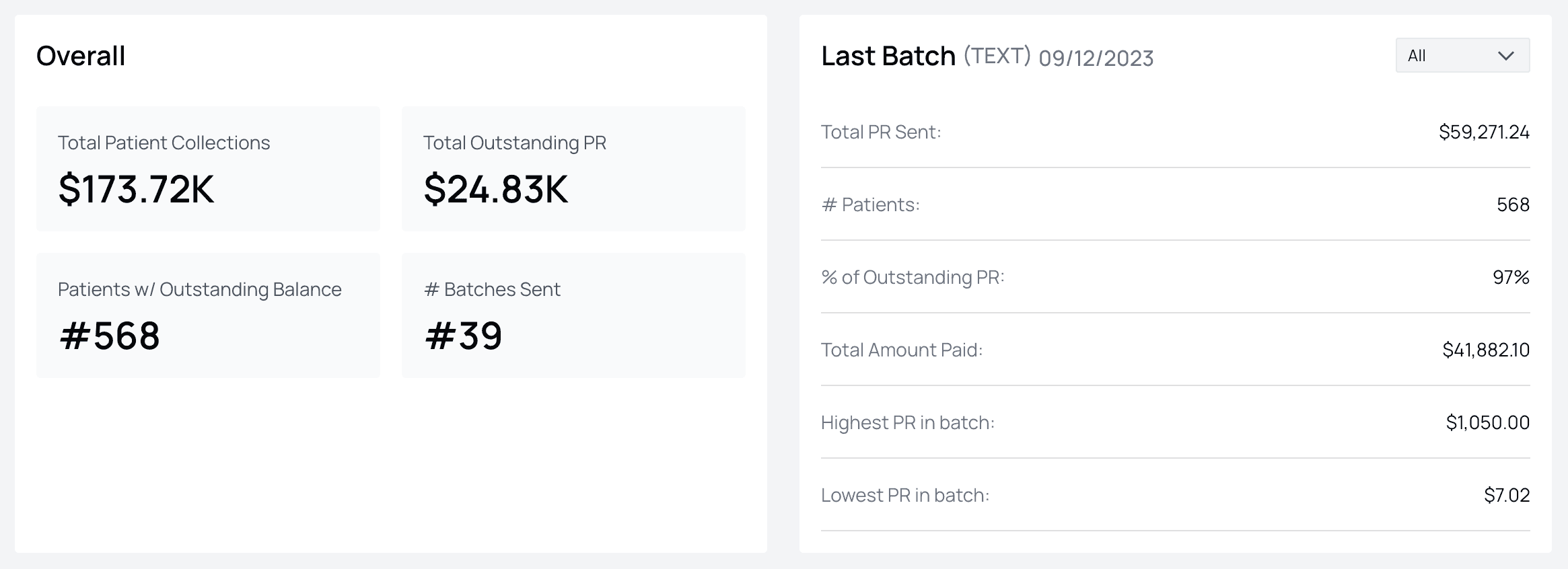 Keeping an eye on the batch-level analytics is important, but at the end of the day the most important metric is: how much have you been paid, and how much is still owed? This is precisely what is tracked at the top of the Patient Statements tab, so you can swoop in and know in a few seconds how your practice is performing on PR collections overall.