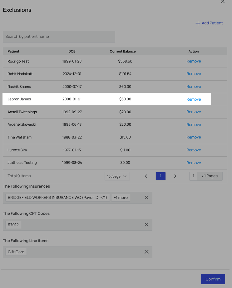 Use the Exclusion Settings to ensure that specific patients, or patients with specific insurances, CPT codes, or line items, do not receive automated patient statements.