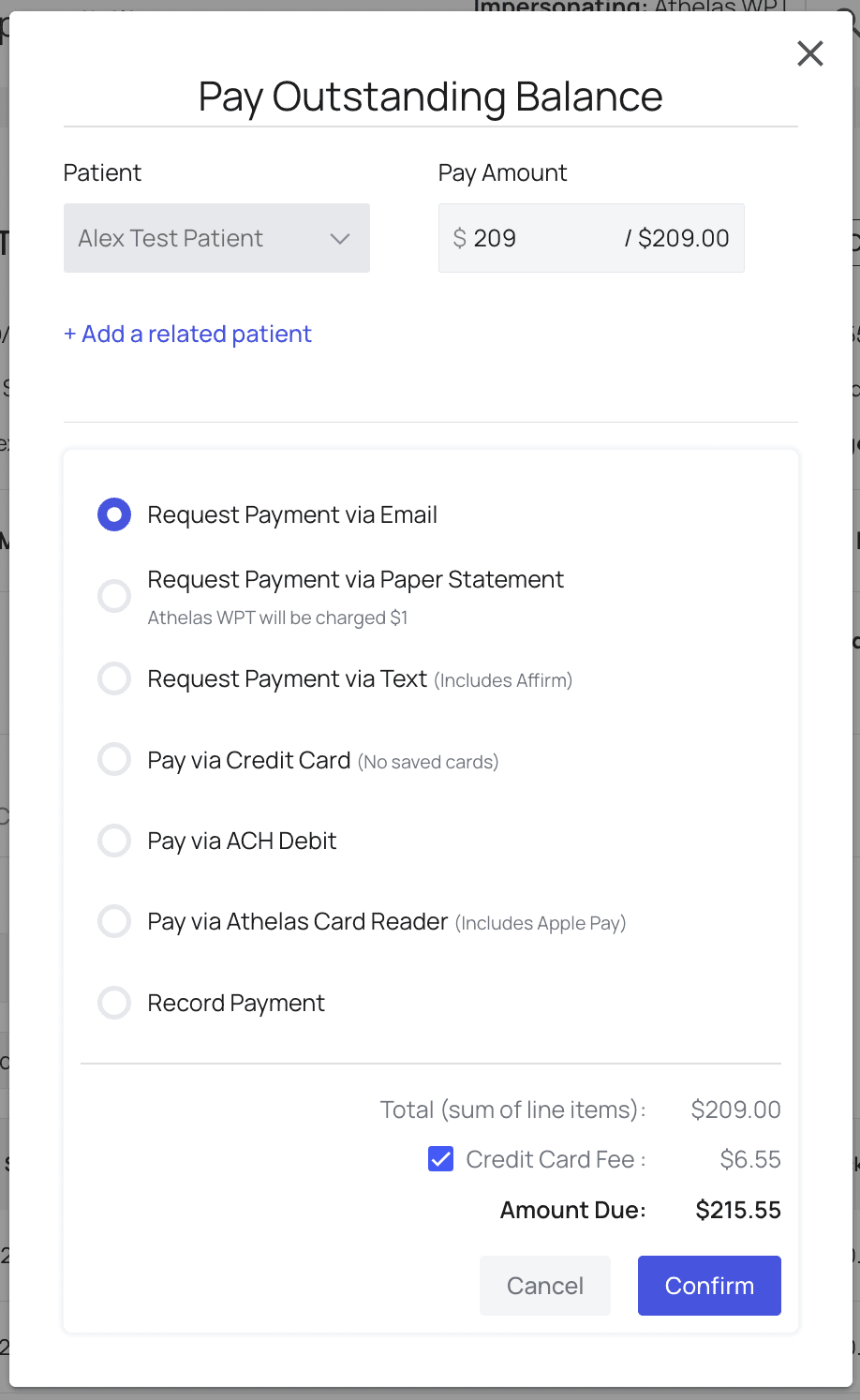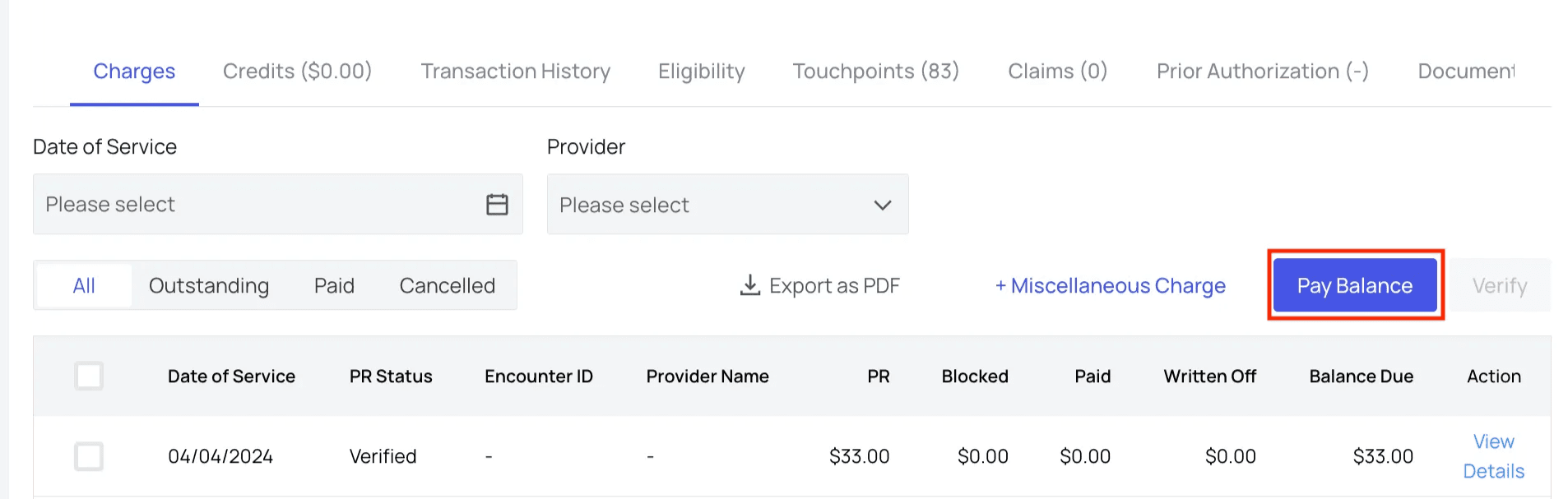 Pay Balance.Note: this button will be disabled if the patient does not currently have a balance.