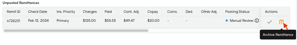 - In this case, it is safe to archive the unposted remittance by clicking the orange box icon in the Actions column.