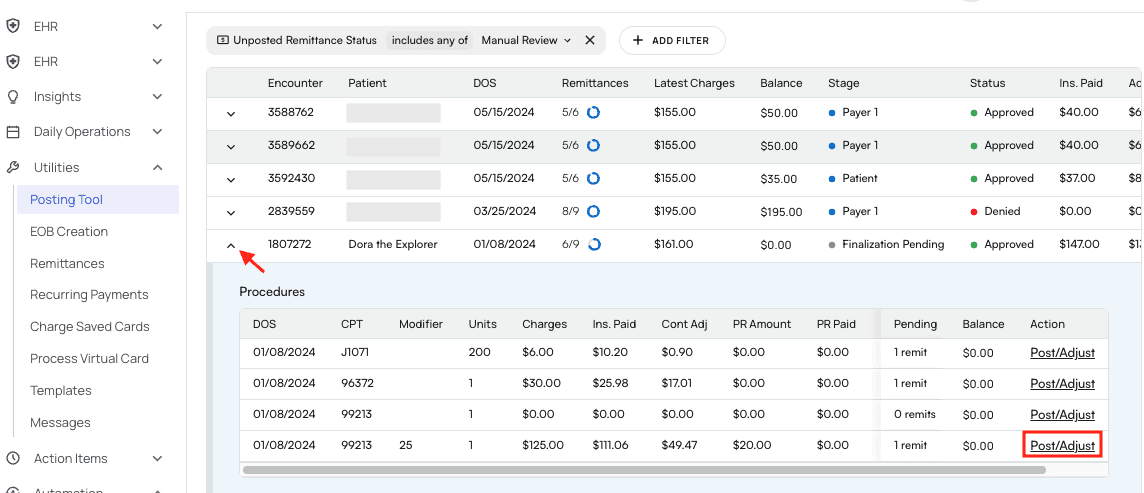 - Visit the Posting Tool page and find the encounter of interest. Click its arrow icon to see procedures listed by DoS.