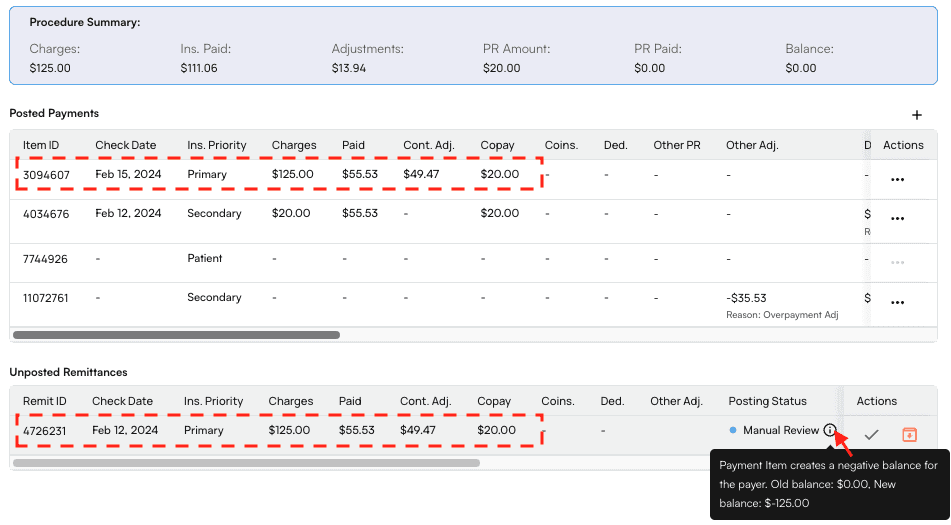 - The remittance for manual review will be in the Unposted Remittances list.- If you hover your cursor over the information icon, a tooltip will explain why this remit is unposted. In this example, we can see that the remit will create a negative balance (indicative of overpayment) if it is posted.