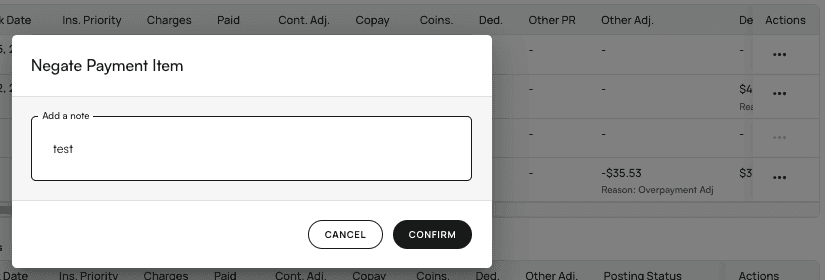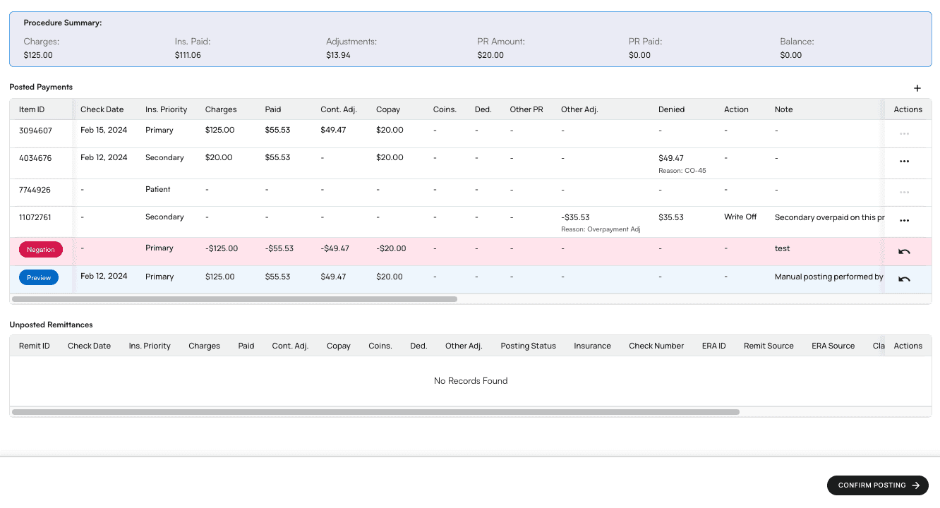 - Click the green checkmark ✅ next to the unposted remittance. This will bump it up into the Posted Payments list in preview mode, highlighted blue, underneath the negation preview you just made.