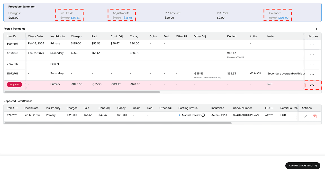 - Your negation will be in the Posted Payments list, highlighted red, indicating that it is currently an unconfirmed preview. You can see how confirming this negation will affect the encounter’s financial information, written in blue text in the Procedure Summary.