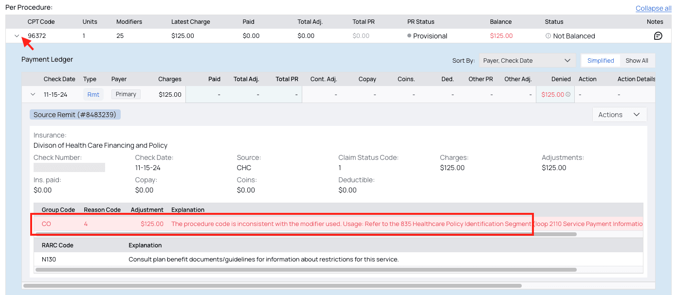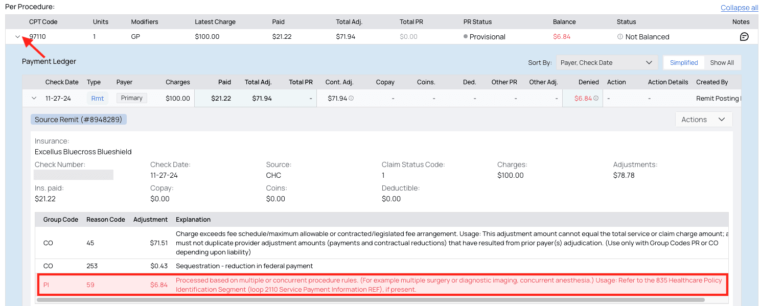 - Despite those allowed amounts, some portion of the charged amount has been denied on at least one procedure- Example: An encounter has a procedure with 25 contractual adjustment, and $5 denied CARC