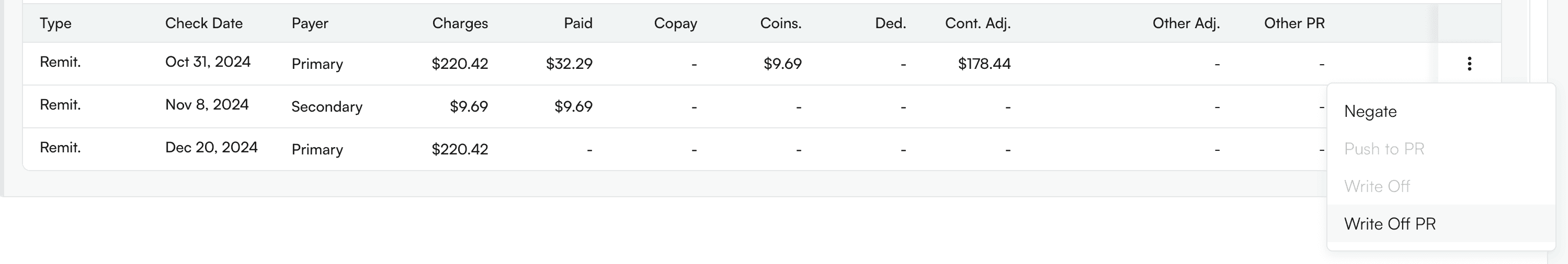 ⚠️ Currently, Write Offs can only be applied to procedure-level Payment Items. A Patient Responsibility Write Off removes a balance that was assigned to the patient but should no longer be collected. This is typically used when your organization decides not to bill the patient for a portion of their responsibility (copay, deductible, or coinsurance). Like payer write offs, this is a net-zero operation: the amount is moved out of the corresponding Patient Responsibility column and into the Other Adjustments column. This reduces the outstanding patient balance on the encounter by the written-off amount. How it works:- Locate the remittance with a patient responsibility balance (copay, deductible, or coinsurance) you want to write off in the Payment Items Table.