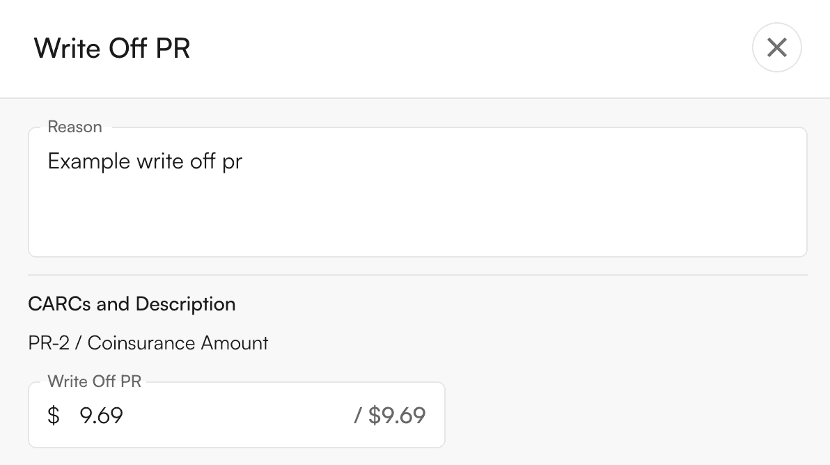 - Enter a reason for the write off and specify the amount to write off for each PR CARC. Then click Write Off PR.