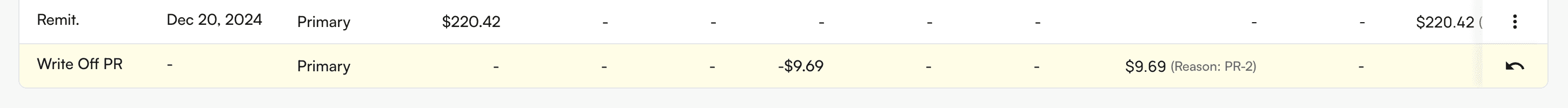 - Review the preview. Crossed-out values with updated values beside them will show how the write off affects encounter-level and (if applicable) procedure-level amounts. Click the undo button (in the right-most column) to remove this preview.