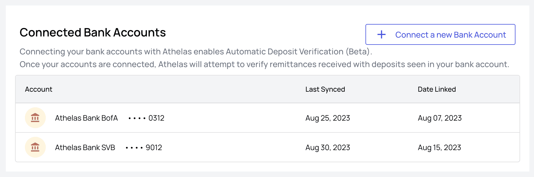Once you’re ready to start automatically matching remittances and deposits we’ll need to connect to your bank account via the Athelas/Plaid integration. Here’s how to do it: From the main Remittances tab, click theConnect Bank Accounts button. This will take you to the linked accounts screen.