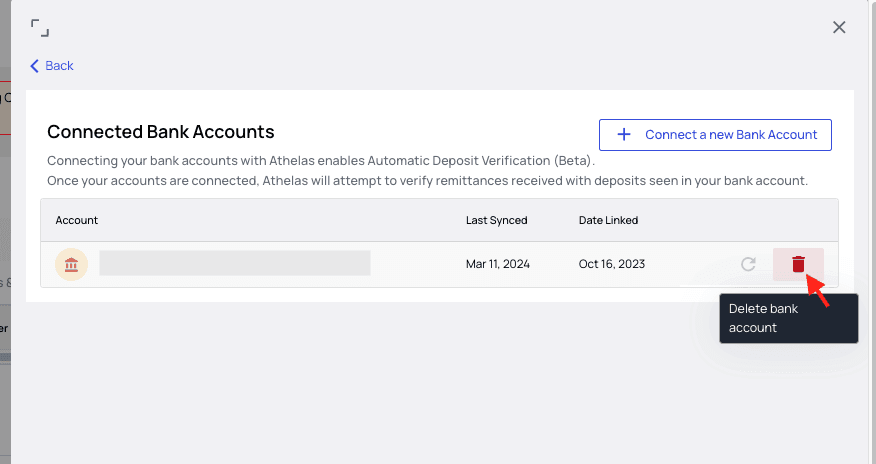 To refresh or remove an account, simply click ‘Manage Bank Accounts’ on the Remittances page, then click either the Refresh or Delete icon for that account.