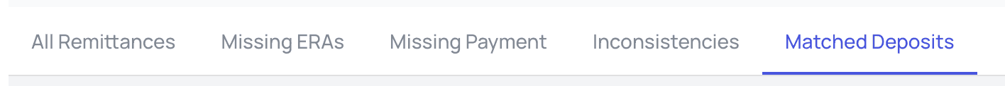 - View All — in this view you’ll see a combination of both remittances and deposits. Any that have been matched will appear combined into a single line item, but you’ll also see rows for unmatched remittances and unmatched deposits.