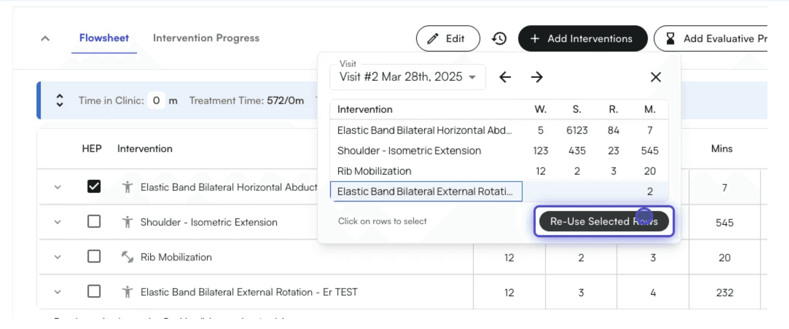 After selecting interventions you want to re-use the values from, click the Re-Use Selected Rows button, and that data will be pulled into the current visit