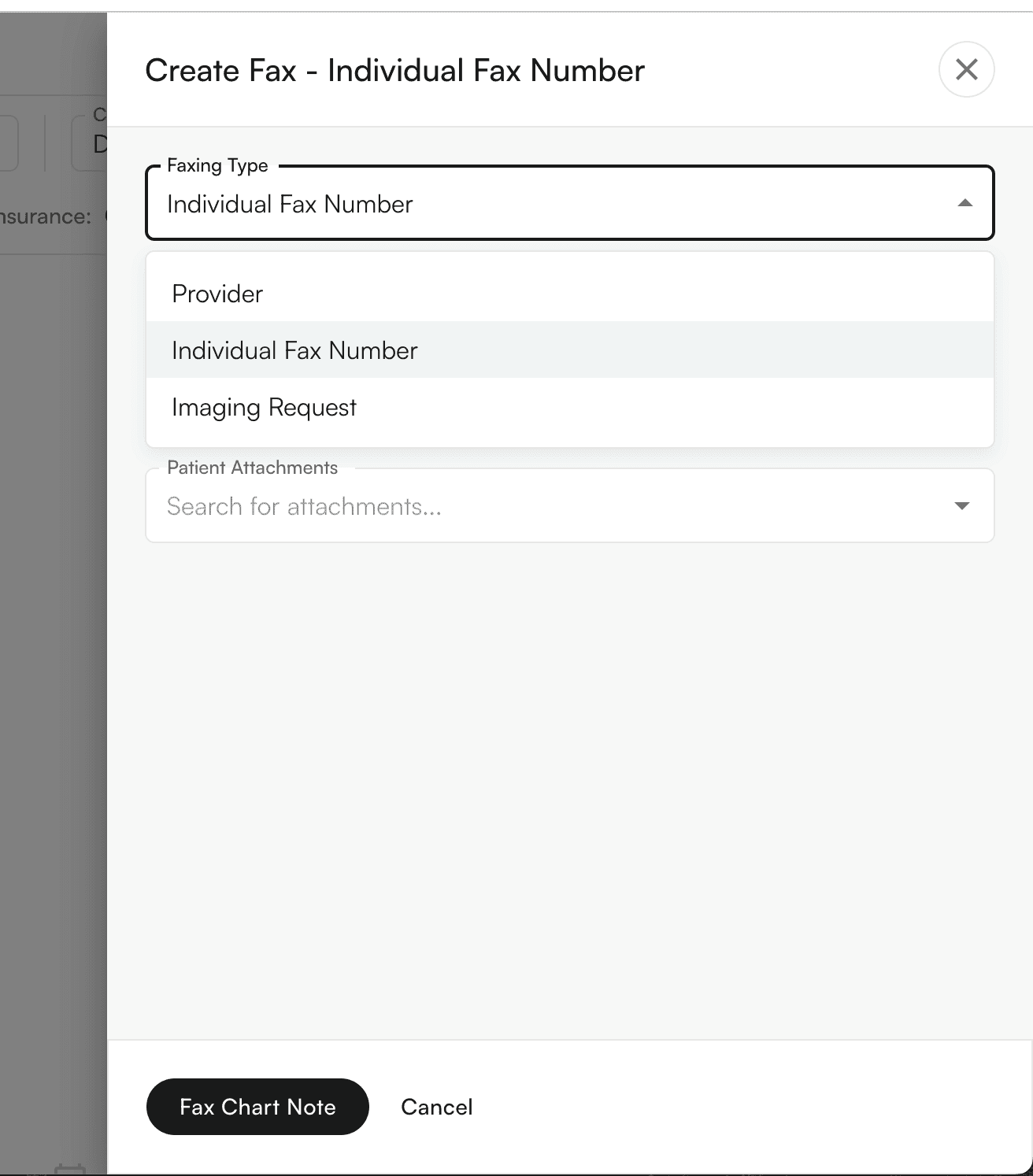Providers can also Fax the chart note through the Chart note itself. Navigate to the “Fax” section of the Chart note. You can “+ Create Fax”, select the Faxing Type, and input required information: